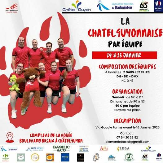 Le ChatelBadminton vous propose sa 11e édition de son tournoi en équipes "La Châtelguyonnaise". Il se déroulera pour la première fois sur 2 jours les 24 et 25 janvier ce qui permettra de ne pas laisser trop d'équipes sur le côté !.